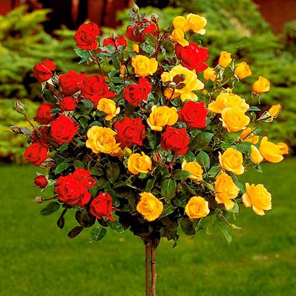Стандартните рози се различават от храстовите рози по буен цъфтеж и необичаен външен вид. Малките дървета са покрити с двойни пъпки, които цъфтят през лятото. За да отгледате стъбло, трябва да използвате шипка, която се нарича кучешка роза. Такова растение има силни издънки и е подходящо за отглеждане на дървета.
