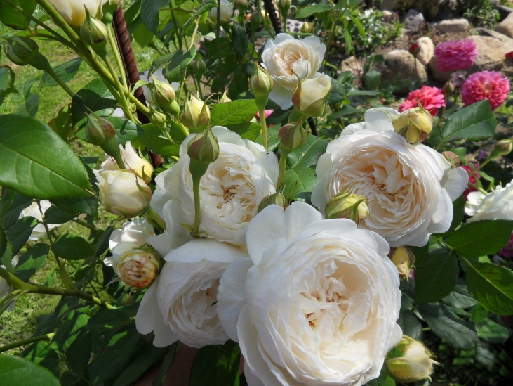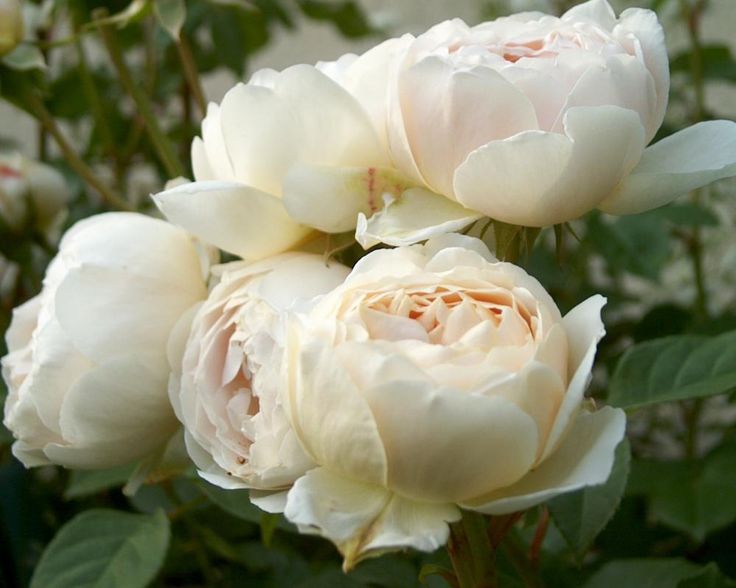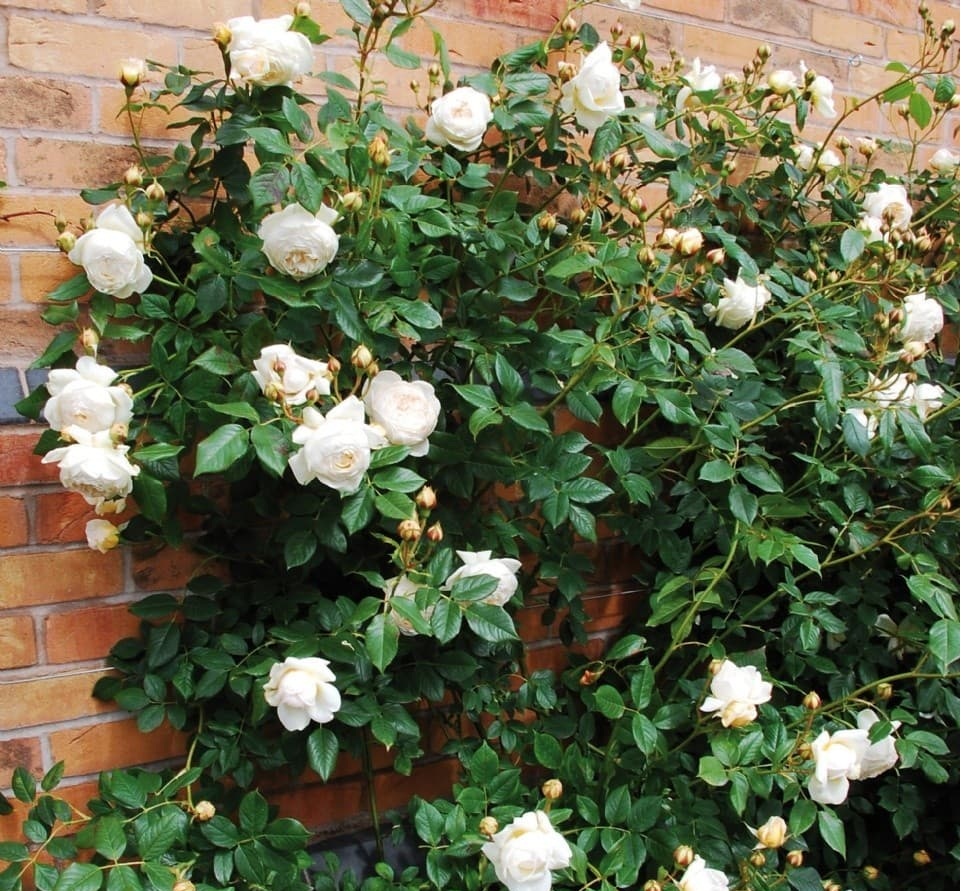 В колекцията на Дейвид Остин снежнобялата Клер е най-важната перла: белите цветя, събрани в богати съцветия, са разположени върху изправени издънки