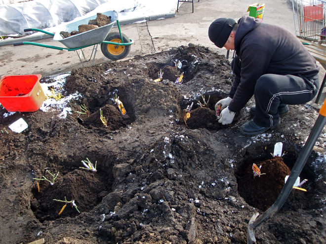 - На подготвената земя се изкопават ями за разсад. Дълбочината на дупката се изчислява по формулата: +15 см до размера на корена.
