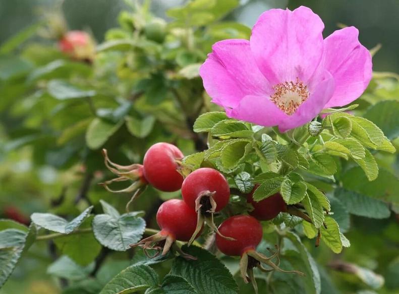 Плодове и пъпки на набръчкана роза