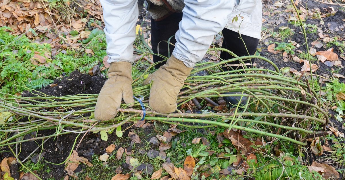 Преди изграждането на заслона стъблата на розите се огъват надолу с куп. Правят го внимателно, за да не се счупят