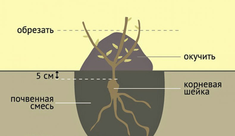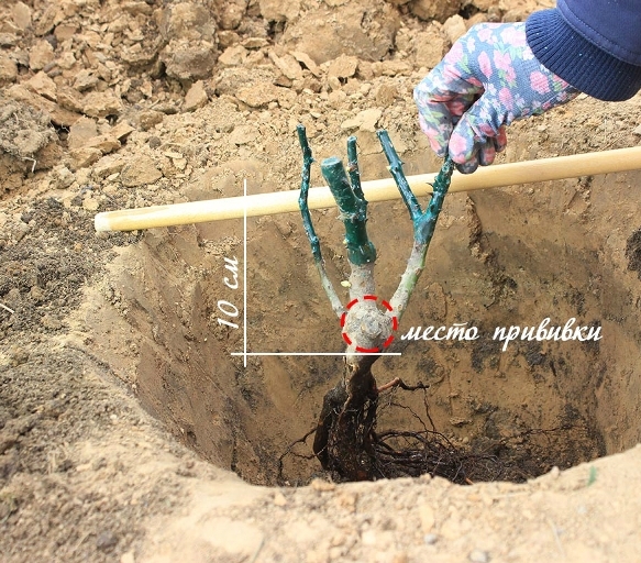 Мястото за ваксинация е началото на растежа на нов летораст; той не може да бъде наранен или изложен на рязка промяна в температурата. Ако при засаждането падне под голям слой почва, където температурата е много по-ниска, отколкото на повърхността, тогава растежът на растението ще се забави. Корените могат да се появят на мястото на присаждане и храстът ще се вкорени. Въпреки това също не си струва да надценявате мястото на придатъка над почвата. Оптималната дълбочина се счита за 3-5 cm.