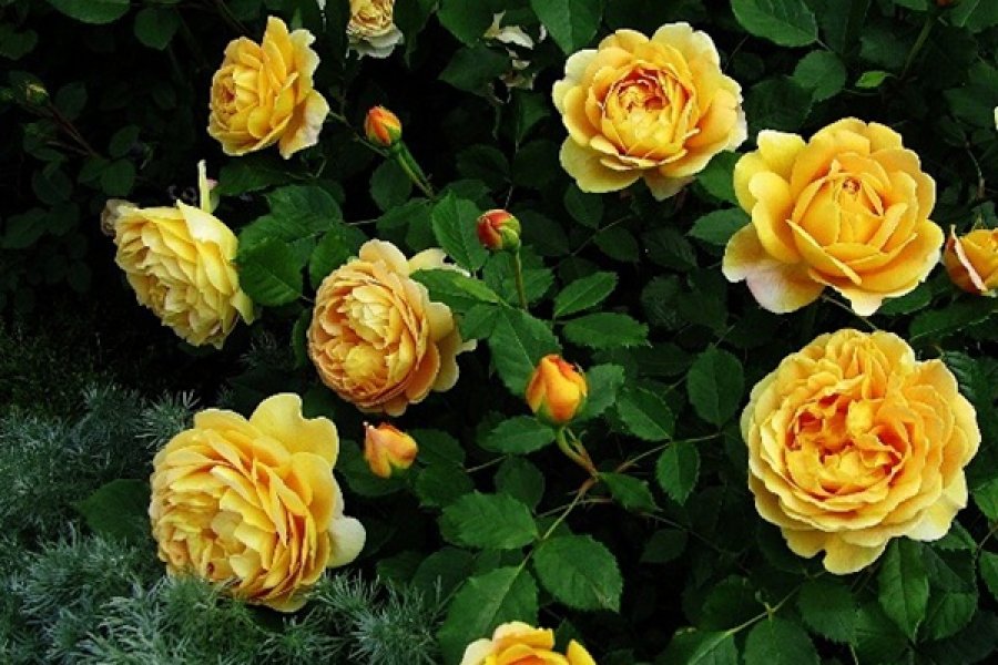 - Златен празник. Английската роза, наречена Golden Celebration, има големи кълбовидни цветя с необичаен медно жълт оттенък. Този ефект се появи поради наличието на малки розови точки върху венчелистчетата на ясно изразен жълт фон. Това може да се види, ако се вгледате внимателно.
