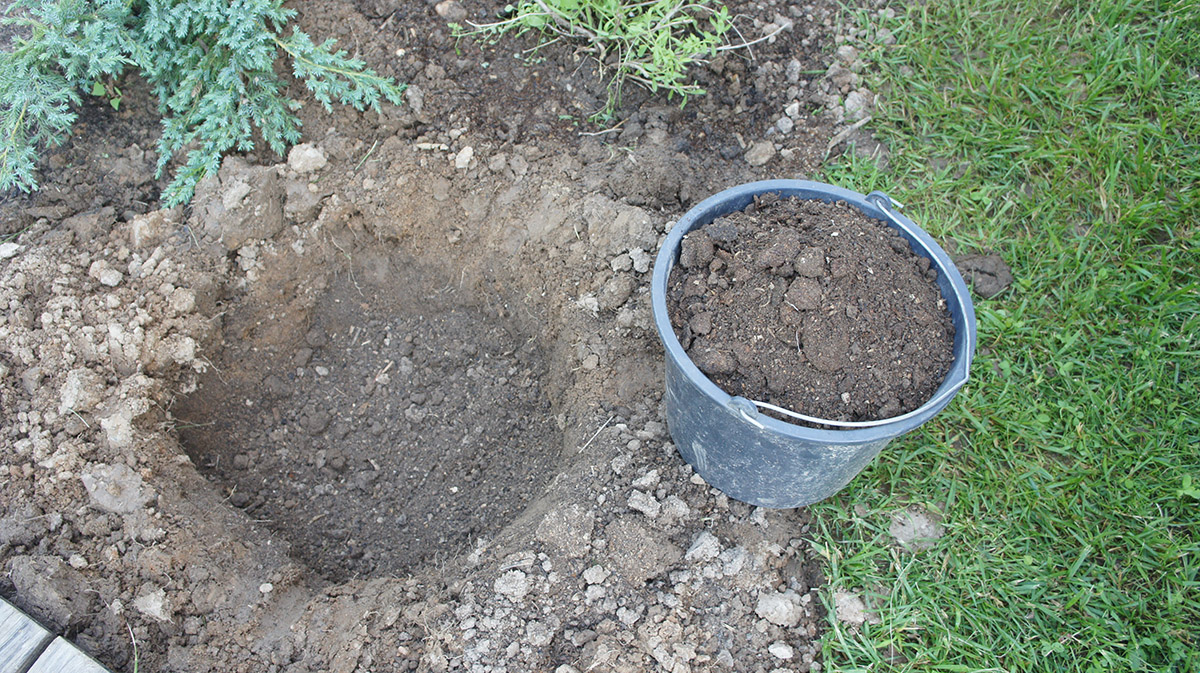 - подгответе дупка с дълбочина около 30 см, напълнете я на 2/3 с плодородна почва;