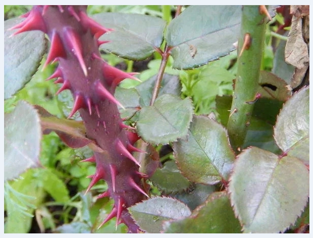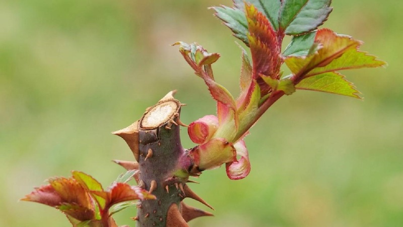 - Розите имат млади издънки с тъмночервен цвят, а шипките имат зелени.