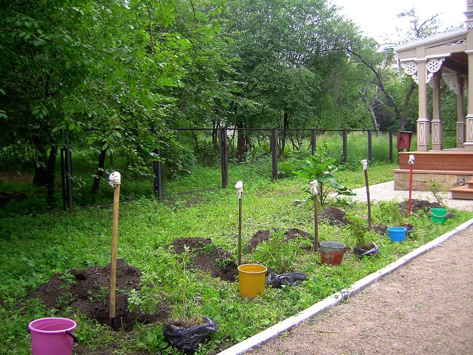 - Ямата се полива обилно, плодородната горна част на земята се пълни с торове в ямата. След това трябва да оформите могила.