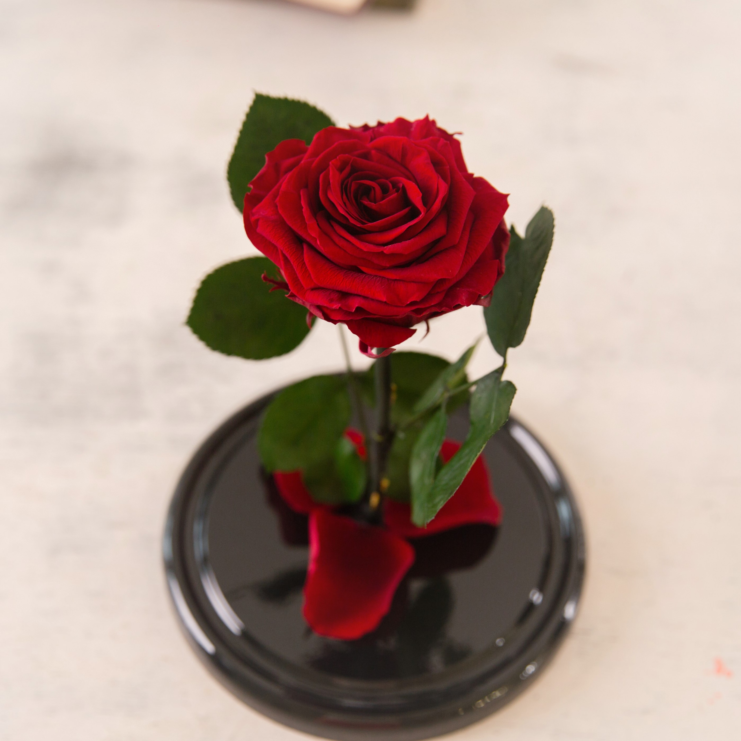 След приготвяне на пъпката се закрепва към изсъхналото стъбло и цветето се поставя върху полирана дървена стойка. Накрая розата се покрива със стъклена колба, за да се създадат благоприятни условия за дългосрочно съхранение.