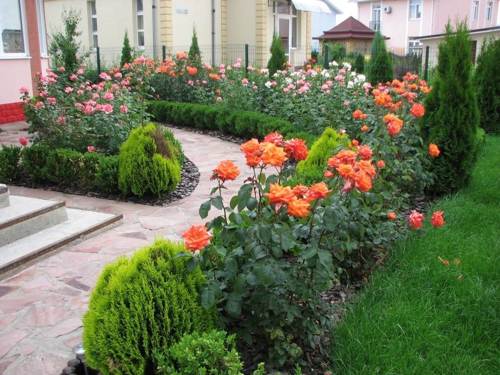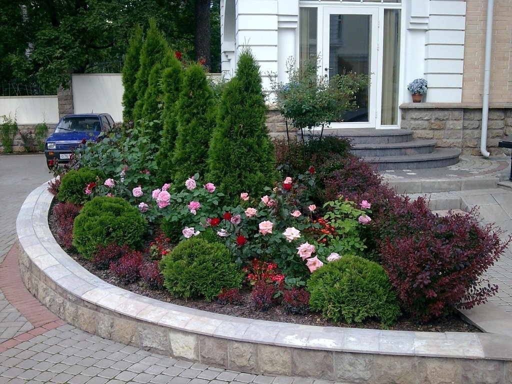 Цветница с рози и иглолистни дървета