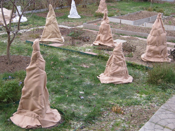 Над храста е необходимо да се направи рамка, върху която се хвърля нетъканият плат. Розата трябва да бъде покрита с 2-3 слоя плат. Покрийте го със смърчови клони, за да създадете въздушна възглавница.