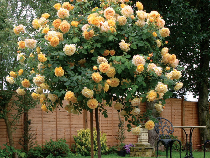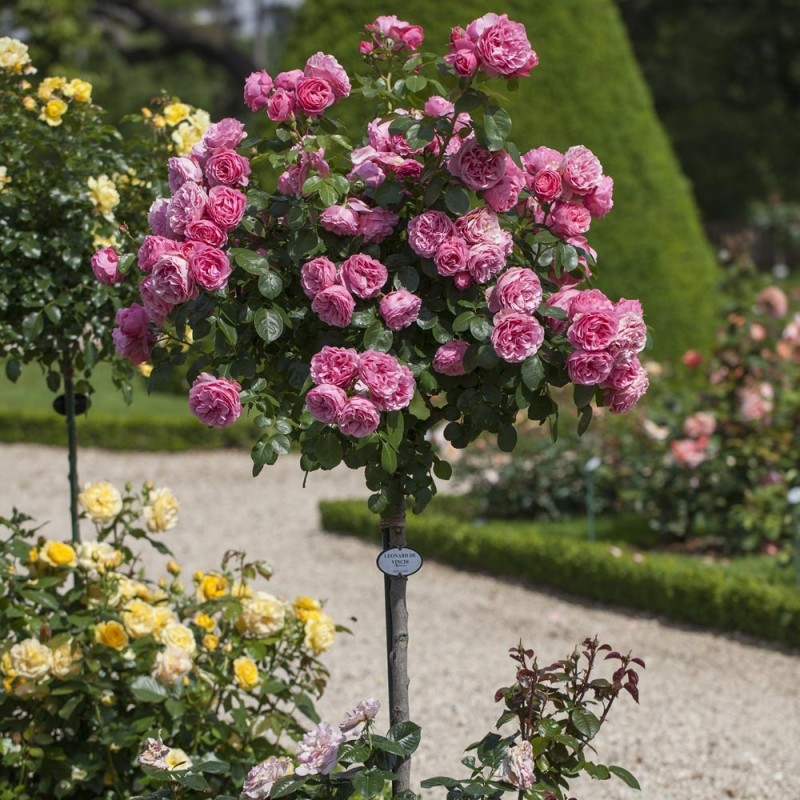Стандартните рози също се различават по височина и големи пъпки. Тези сортове са отглеждани през 18 и 19 век. По това време дамите носеха доста обемни поли, което им пречеше да се приближат до цветния храст и да се насладят на аромата на пъпките. Ето защо беше решено да извадите дърво с дебел ствол и широка корона - по-лесно е да стигнете до него.