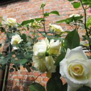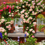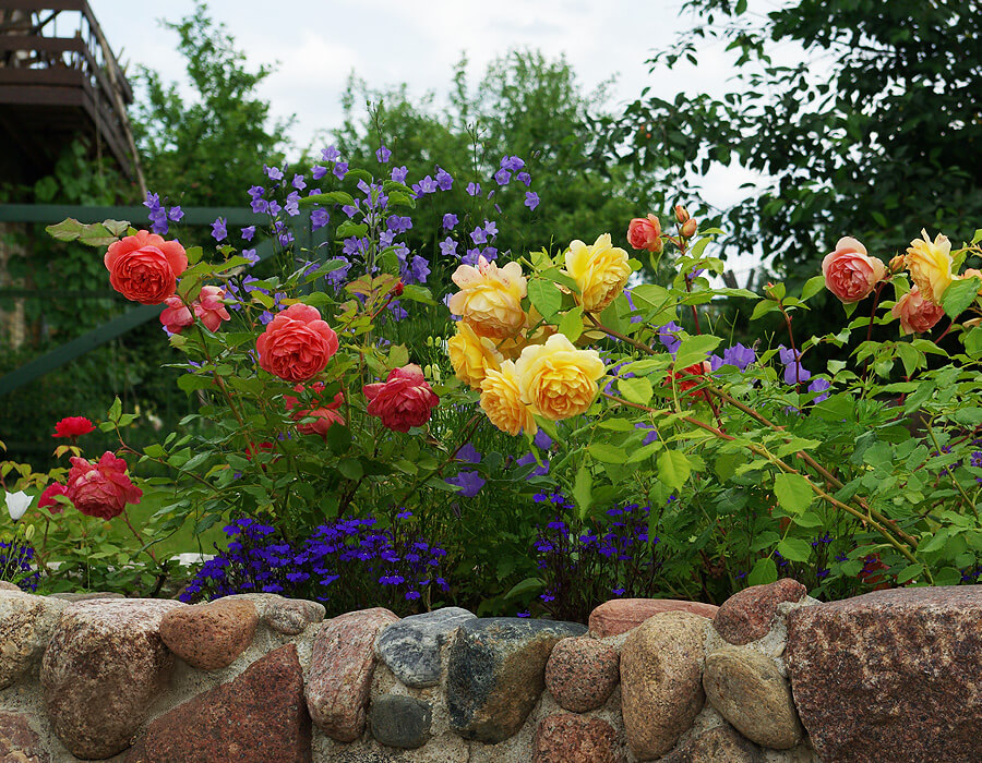 Катерещите се рози изглеждат страхотно на арки, сортовете джуджета украсяват предните места на цветни лехи и кант пътеки. По-високи храсти са поставени в централната част на цветните лехи. Препоръчително е да комбинирате рози със следните растения: