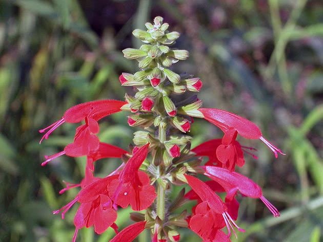 Салвията червена е кратко растение, което може да цъфти от началото на лятото до самата слана. Повечето от тях имат съцветия с яркочервен, лилав цвят, има сортове с тъмно розови цветя.