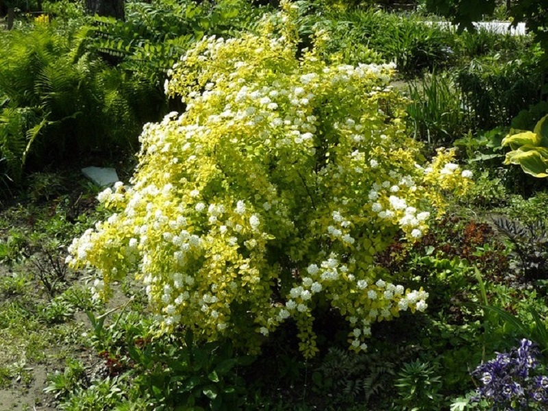 - Spirea Gold Fontaine. Храстът има разперени клони, покрити с жълто-зелена зеленина. С настъпването на есента широколистната покривка придобива жълт оттенък и зоната става цветна. През май златният храст е покрит с щитовидни бели съцветия, които радват ценителите на красотата на японската градина. Сортът е непретенциозен към почвите, устойчив на замръзване. Фонтанът все още не е добре известен сред градинарите. Принадлежи към бавно растящо растение.