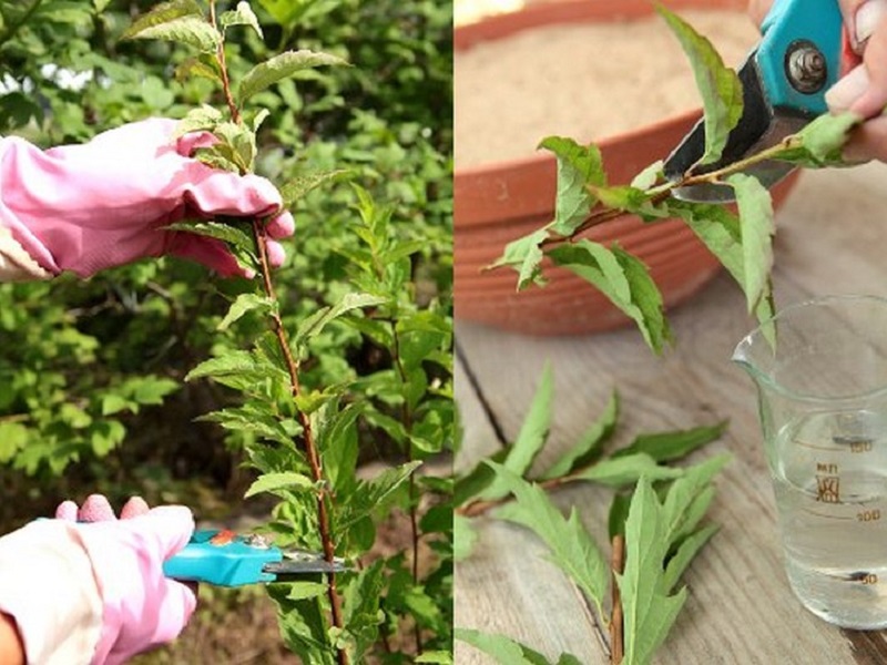 - Рязане чрез стволови процеси. Избират се силни, силни издънки, които се отрязват от растението 2 седмици след цъфтежа. Полулигнираните резници се засаждат в контейнери с хранителна почва, съдържаща торф и пясък в равни части. Покълнат посадъчен материал в оранжерия. Вниманието е да се осигури високо ниво на влажност. През пролетта на следващата година младите растения могат да бъдат засадени на цветна леха.