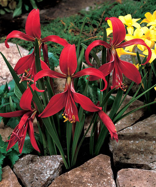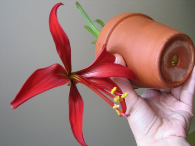 При цъфтежа се образува гладко, кухо червено-кафеникаво стъбло, което е увенчано с голямо асиметрично цвете. 6 удължени венчелистчета се извиват сложно и образуват красива форма.