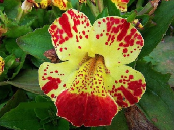 Нарича се още mimulus tigrinus, едроцветен mimulus, leopard mimulus, хибриден mimulus (Mimulus hybridus), mimulus maximus. Това е най-популярният сорт, който е особено обичан от производителите на цветя в градините си. Едногодишно растение. Височината на храста е 20-25 см. Съцветията приличат на четки. Пъпките имат разнообразен цвят, но винаги пъстри. Цъфтежът продължава от май до юли.